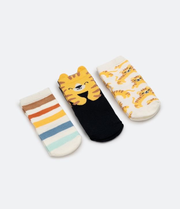 Kit 03 Pares de Meias Infantis com Antiderrapante e Estampa de Tigrinho - Tam 0 a 12 meses